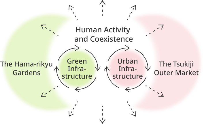 Creating spaces for relaxation and interaction that make the most of the city’s rich waterfront,while promoting cutting-edge, environmentally conscious urban development to breathe life into Tokyo as a modern water city.