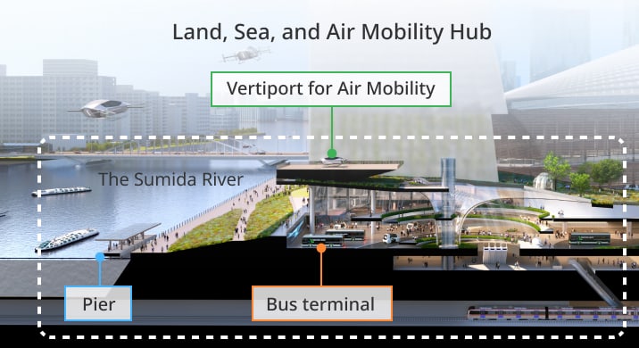 Reviving the waterways that once supported Edo, the project will establish water transport as a familiar mode of tourism and daily transit, bringing new vibrancy to the waterfront. In addition, the area will be developed into a mobility hub that integrates diverse transport options—land, sea, and air—including cars, subways, and a heliport.